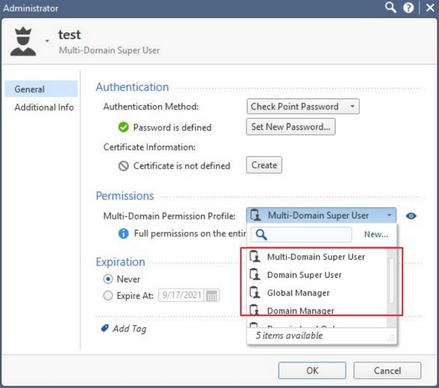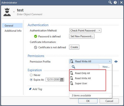 1.Assign permissions to the account that you use for your NetBrain system to access the Checkpoint data. You can select any of the following three permission profiles in General > Permissions > Permission Profile.