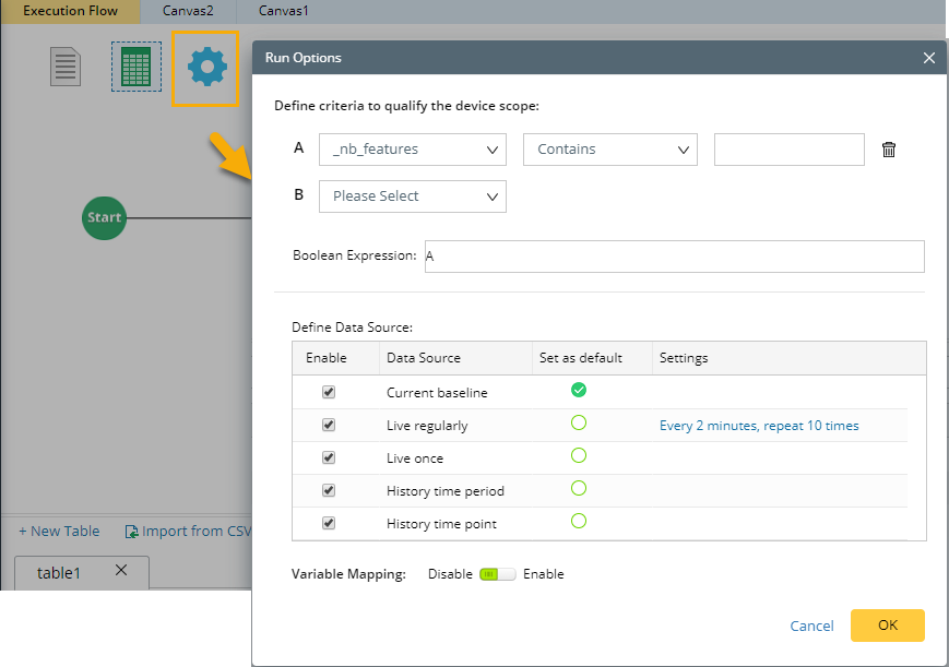 Filter Criteria is used to define conditions to filter the applicable devices out of all devices obtained at the Start node. When you run a Qapp, the filter criteria will be performed, and only the devices meeting the conditions will be passed to Device Queue awaiting the Qapp to execute.