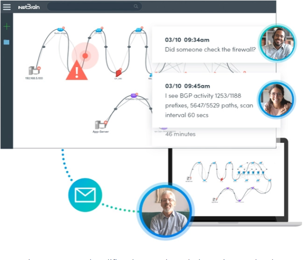 Collaborative Automation is where engineers and operators leverage the knowledge of peers with software that captures subject matter experts' knowledge to create executable automation units that others can then add to their own diagnoses. Expertise is available even when the expert is not. NetBrain helps when troubleshooting a problem, assessing the state of the network, or making sense of complex technology. It allows the NetOps staff to gather, analyze and visualize 1,000s of KPIs in seconds. It can be coupled with our collaboration capabilities to allow multiple ops teams (SecOps, DevOps, NetOps, ServerOps) to interactively resolve problems that span multiple technology domains without the need for time-consuming handoffs which result in delays. Everyone can get online at the same time and interact and make updates and remediations to the model through a shared analysis console