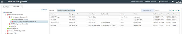 3.In the Fine Tune tab, click Latest CLI configuration Retrieval Failed in the left pane. All latest CLI failed devices are listed.