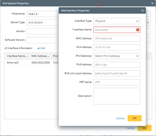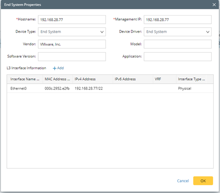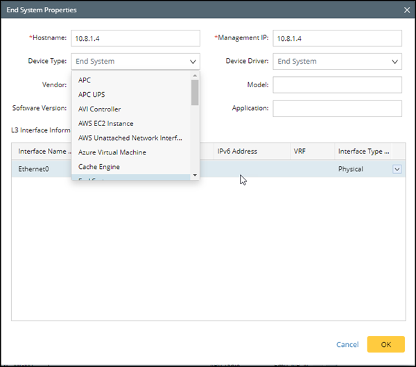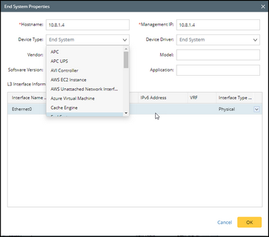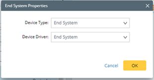 oIn the End System Properties window, you can select Device Type and Device Driver for the new End system.