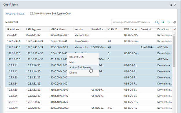 Tip: To resolve DNS name for multiple end systems, select them by pressing the Ctrl or Shift key, and then right-click to select Resolve DNS.
