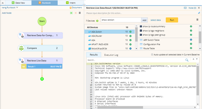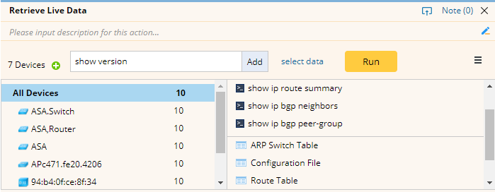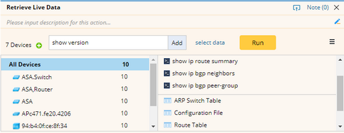 Retrieving live data automation action is used to retrieve device data by executing specified CLI commands and selecting built-in data types, such as configuration files, device and Interface information, Route/ARP/MAC/NDP/STP table, BGP advertised-route table, and NCT table. When retrieving live data, the system attempts to access devices by using Telnet/SSH first with the credentials configured in the Network Settings, and then issues CLI commands to retrieve data.