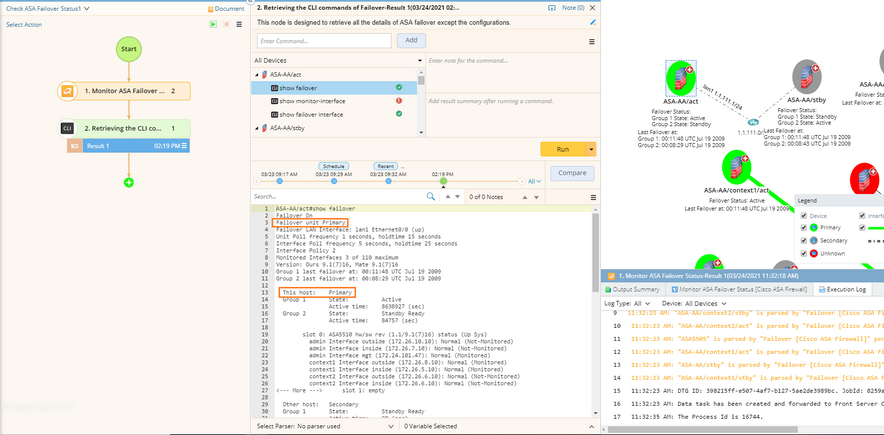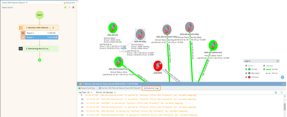 3.In the Monitor ASA Failover Status Qapp node, add target devices, select Pull live data once in the Data Source area and click Run. The active and standby status of ASA firewalls is displayed on the map. According to the legend, the ASA-AA/act firewall is secondary and the ASA-AA/stby firewall is primary. You can click Execution Log to view the detailed log regarding how the Qapp retrieves data from target devices.
