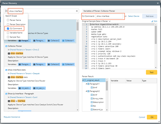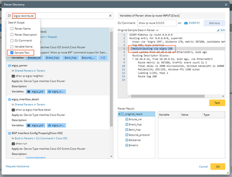 If you want to search for a configuration parser, you can set Sample Data (Text) as the search scope, and type keywords in the configuration file (e.g. eigrp resitribute ) to find your parser.