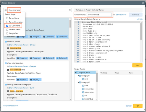 If you want to search for a CLI command parser, you can set the CLI command as search scope, and type keywords in the CLI command (e.g., show interface) to find your parser.