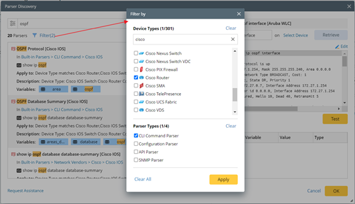 To narrow down your search results, you can use Filter function to filter out results by device type and parser type.