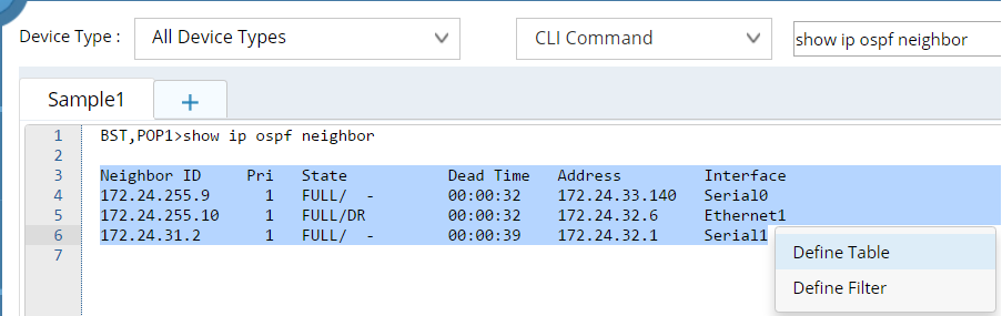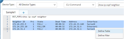 1.Enter the show ip ospf neighbor command and retrieve sample data in the parser editor page. A sample output is as follows:
