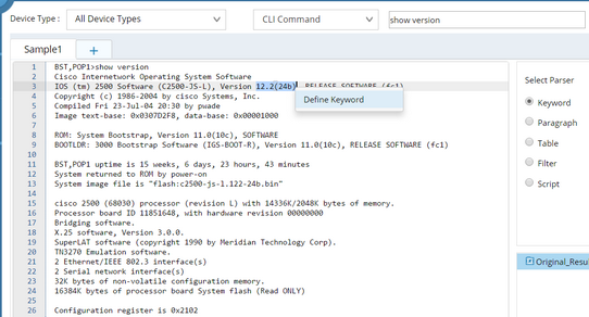 1.Enter the show version command and retrieve sample data in the parser editor page.