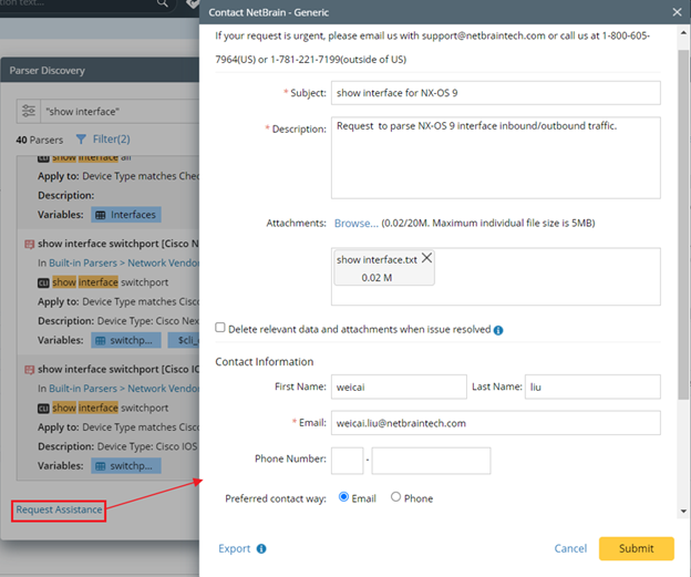 If you cannot find the Parser you want in the Parser Library, you can submit a ticket to NetBrain by clicking Request Assistance: