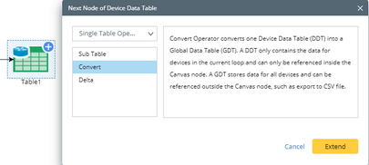 2.Select Single Table Operator > Convert from the drop-down menu and click Extend. Another table node (Table2 in this sample) is created after the Convert node, and no settings are required.