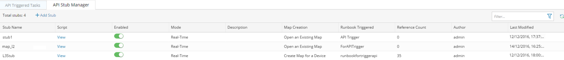 API Stub Manager is used to create API tasks so that a third-party system can call NetBrain API and trigger relevant tasks such mapping devices and collect device data when alerts occur. Once an API task is created, it will be displayed on the API Stub Manager tab.