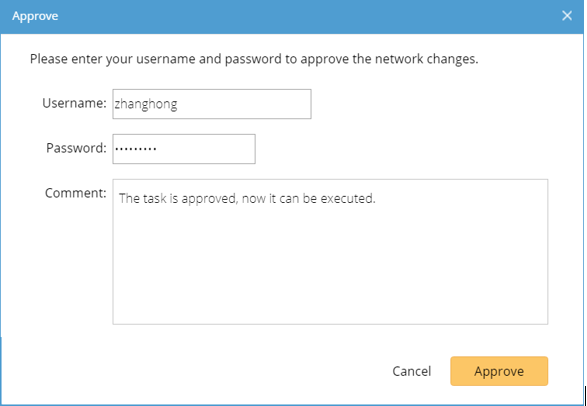 4.In the pop-up dialog, enter the username and password of the approver account, and click Approve.