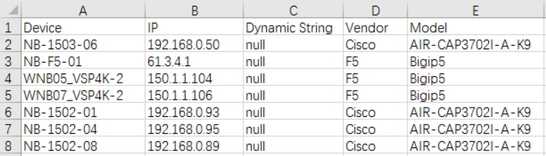 1)Click Import. 2)Select a .csv file with the required device information from your local folder. Here is a sample of the .csv file: 3)Click Open. |