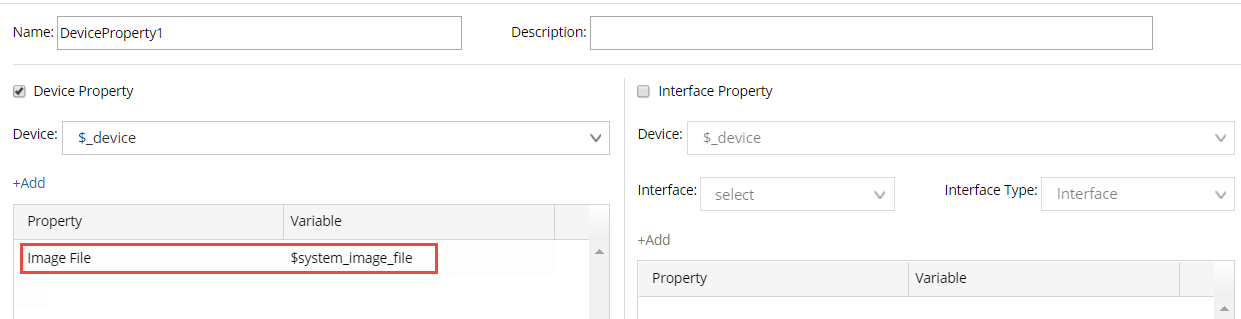 To customize a device/interface/module property, for instance, add the Image File field as a device property for all Cisco IOS switches as follows, you must add the property in GDR.