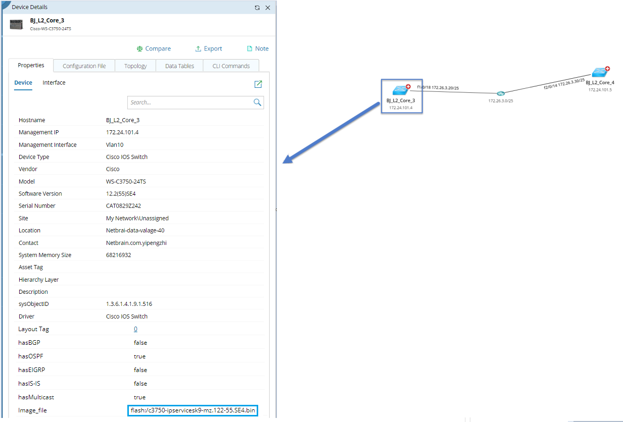 12. Save and run the Qapp on a map with Cisco IOS switches included. Once the Qapp execution is finished, double-click a device to view whether the Image_file field is populated in the Device Details pane.