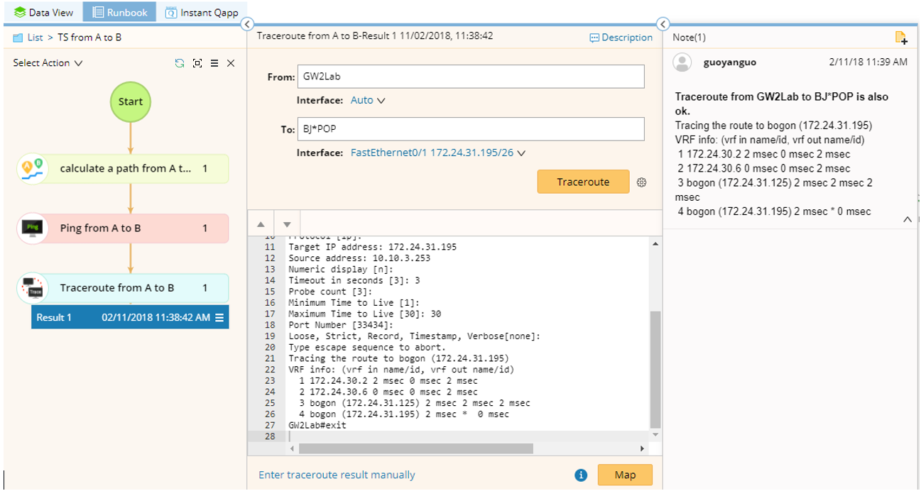 5.Add the Traceroute node and execute the action. Make a note to record the result.
