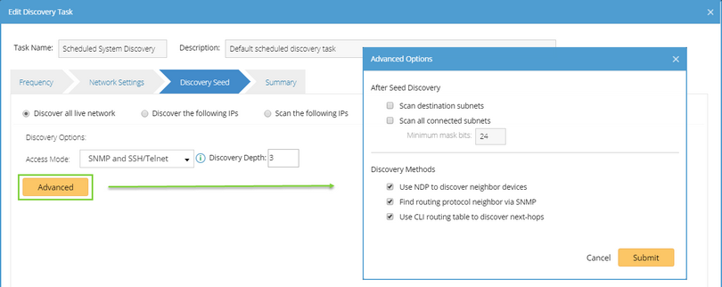 It refers to how deep you want the discovery to go. That is, how many levels of neighbors that will be explored from the seed router. For example, depth 0 indicates only the seed router can be discovered; depth 1 indicates the neighbors of the seed router can be discovered (including NDP neighbors or next hop in the route table). ➢Advanced Options: Scan destination subnets — continue to scan all destination subnets in the route tables of the devices that are discovered in the last depth Note: The option is only available when the option Use CLI routing table to discover next-hops is selected.