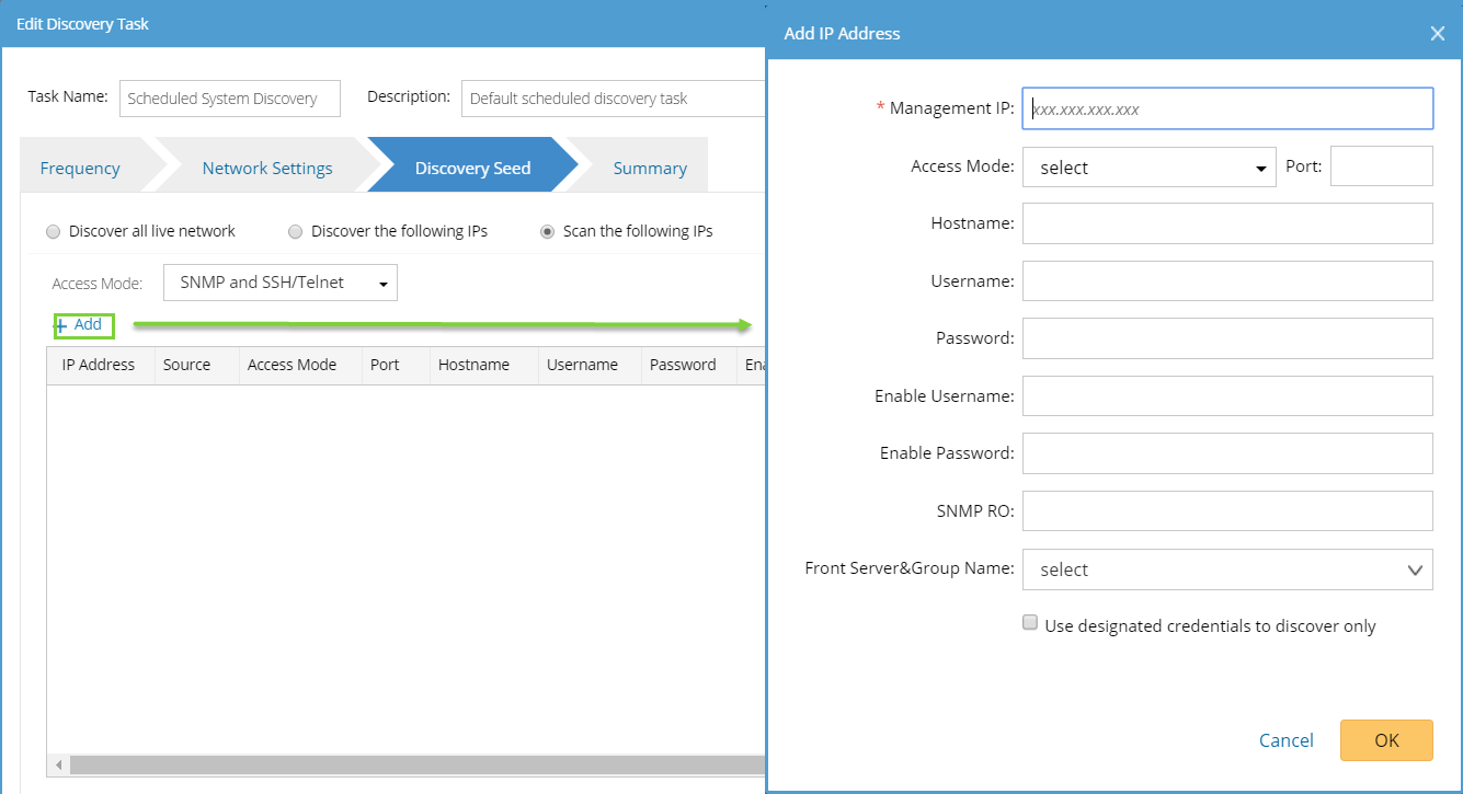It takes the IP addresses you input as seeds to discover new devices by neighbor spreading until the discovery depth is reached. To configure the settings, see Discover all live network for more details.
