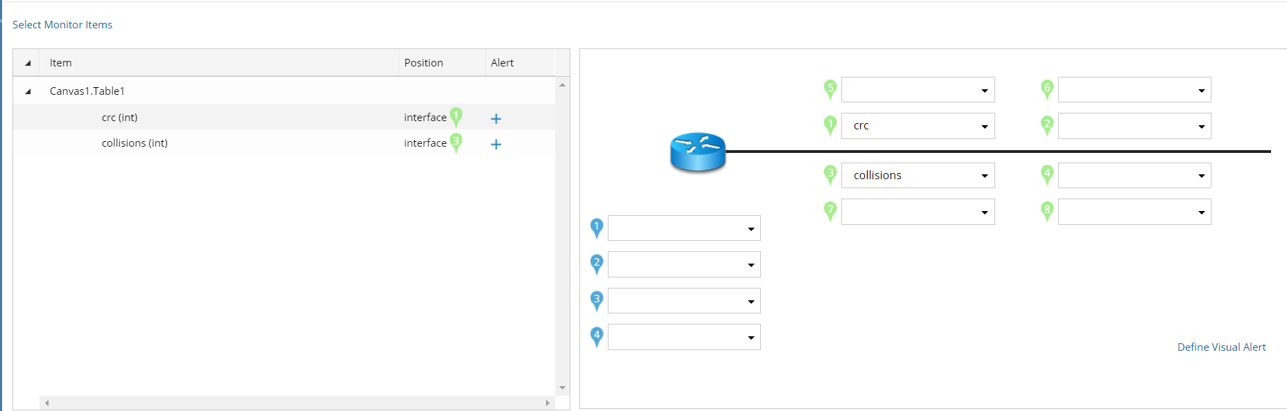 A variable can be displayed as either a device item or the interface item. In this sample, crc and collisions are interface-level variables, and you can select positions along the link.