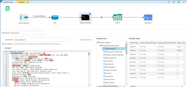 2.Enter show interface in the Command field and select show interface (Cisco IOS Switch, Cisco Router) from the drop-down list. The related command, parser, and variables will be auto-loaded. You can alternatively click Select Parser and select a parser from the Parser Library directly.