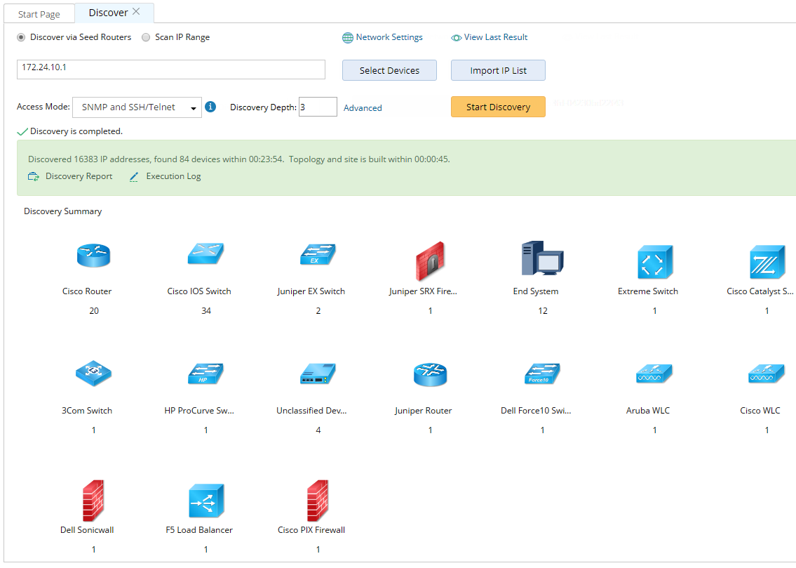 A seed router is the starting point where the discovery begins. With the seed router method, all the discovered neighbor devices will be treated as new seeds, until all devices matching the defined Discovery Depths are discovered. The system enables you to discover all the neighbor devices from the route tables, CDP tables, and SNMP routing protocol neighbors.