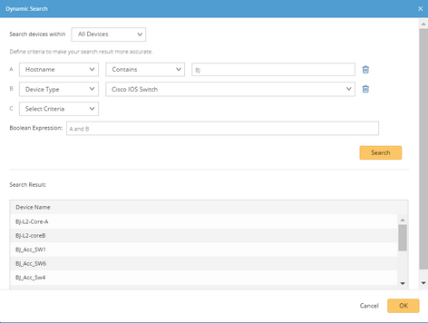 1.Define one criterion or multiple criteria to filter devices. As soon as a criterion is added, the Boolean expression becomes A and B, A and B and C and so on. You can manually change and to or if required.