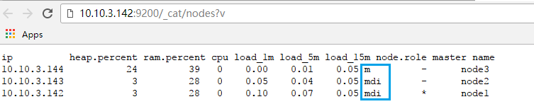 1)Enter http(s)://<IP address of any Elasticsearch node>:<port number>/_cat/nodes?v in the address bar of your web browser. For example, http://10.10.3.142:9200/_cat/nodes?v.