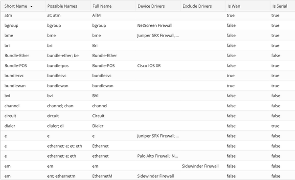 Interface Type is used to manage and define the correspondence between interface short name and full name, such as lo equivalent to loopback. When parsing interface data, the system only recognizes the full name of an interface by default. To support and recognize the interface types in short name, the system maintains an interface type table covering most of the interface types in a network.