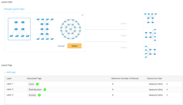 A layout by tag is generated by applying a layout style to a map. A layout style defines the method to organize devices on a map. It consists of layout type, layers, and tags.