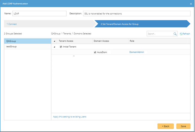 3.Click Add LDAP Authentication. The Add LDAP Authentication Wizard opens to guide you through the steps to connect to the LDAP server and configure the tenant or domain access privileges for imported group users.