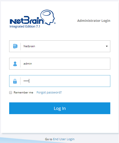 Note: If your user account is managed in a third-party user management server (LDAP, AD or TACACS+), you need to select the authentication server from the drop-down list. If your user account is created and managed in NetBrain system, select the NetBrain option.