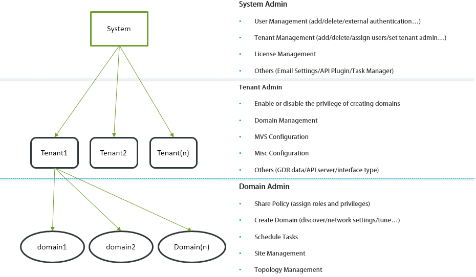 The administrative management for each level of admin is illustrated as follows.