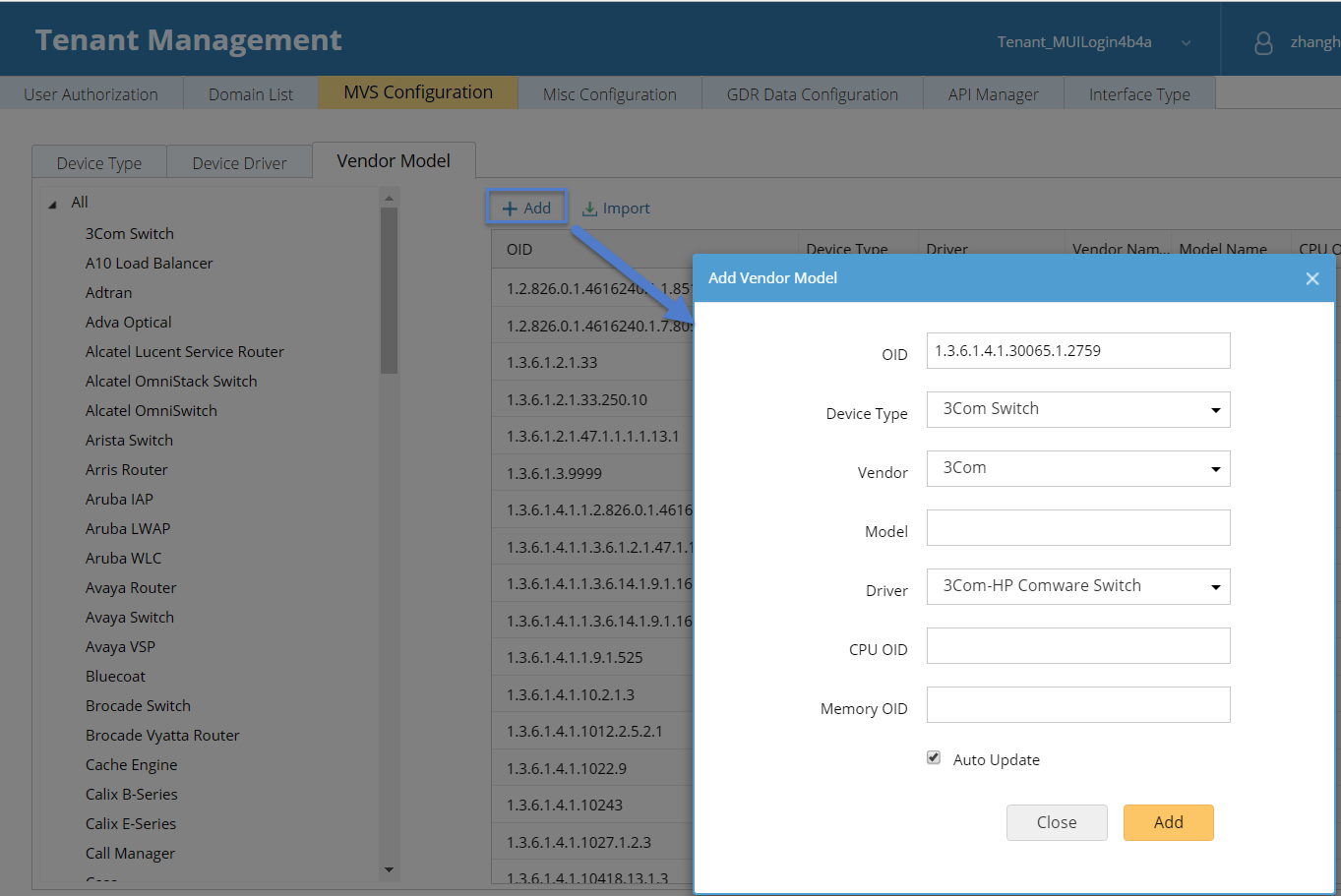 b)Select MVS Configuration > Vendor Model, and then click Add.