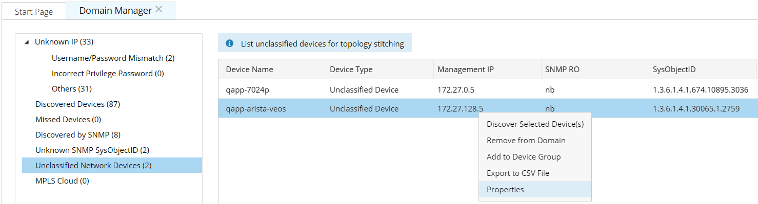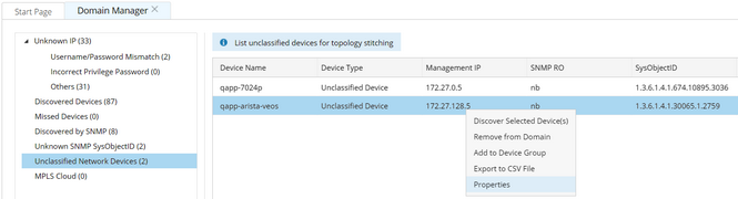 Unclassified Network Devices refer to the devices with unidentified device types. The system uses the sysObject ID in Vendor Model table to identify the device type. If a device's OID is not available in the Vendor Model table during discovery, the system will take it as an unclassified device. After the discovery, you can check whether there are any unclassified network devices in the Domain Manager.