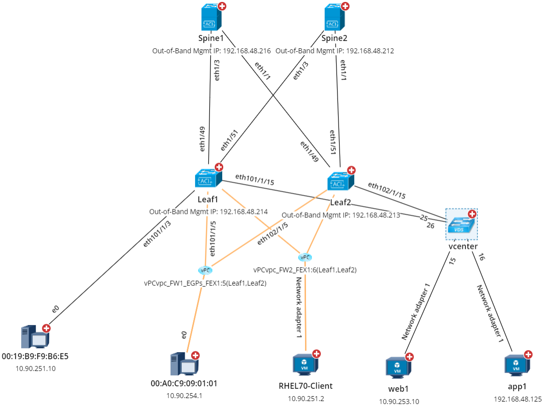 In the Network pane, you can view the network structure of an ACI Fabric in the Network Centric\Tenant View.