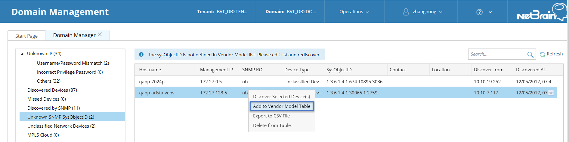 3.In the Domain Manager, select Unknown SNMP sysObjectID in the left pane. The devices with unknown SNMP sysObjectIDs are listed.