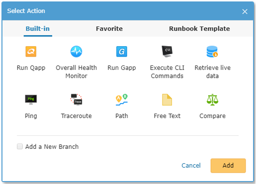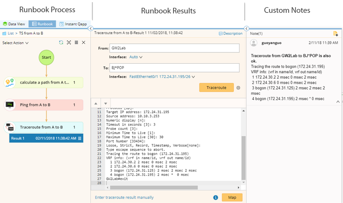 For example, end users run Qapps, execute CLI commands, or use Ping/Traceroute to troubleshoot a problematic area. These actions are instantly recorded in a Default Runbook, and each action can be annotated with thoughts or analysis to document the diagnosis process.