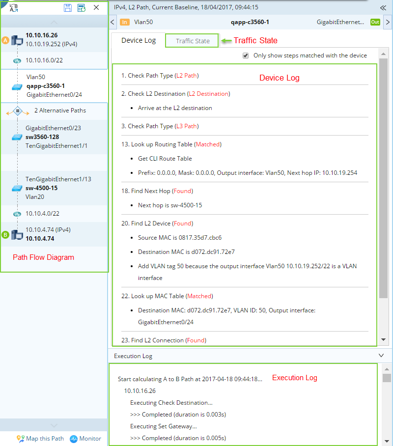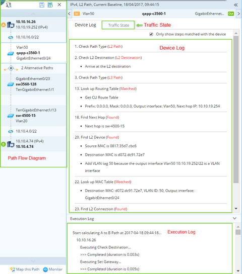 icon to expand the path log and view the device log, traffic state, and execution log in detail.