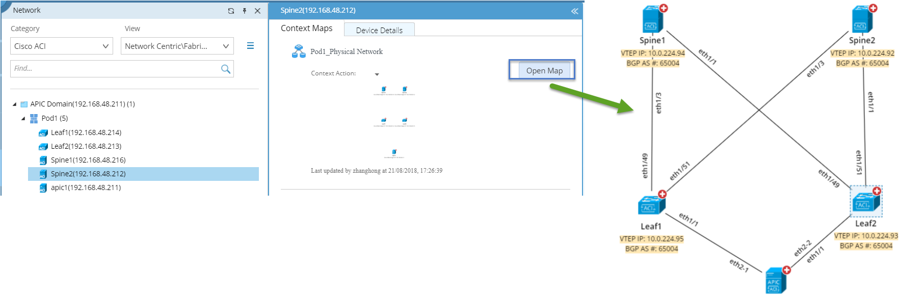5.Select a Pod or device node and select Context Maps tab to view its context maps. The context map displays the physical topology of the selected Pod. You can open the context map and run Qapps or apply a data view to understand the detailed design.