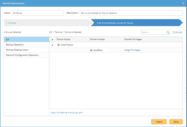 icon and select Add AD Authentication from the drop-down list. The Add AD Authentication Wizard opens to guide you through the steps to connect to the AD server and configure the tenant or domain access privileges for imported group users.