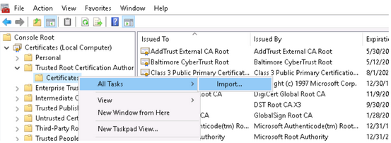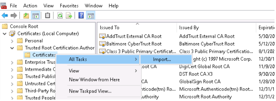 1)Import the CA certificate used on the AD server into the Trusted Root Certification Authority directory as follows:
