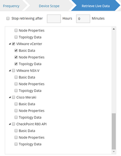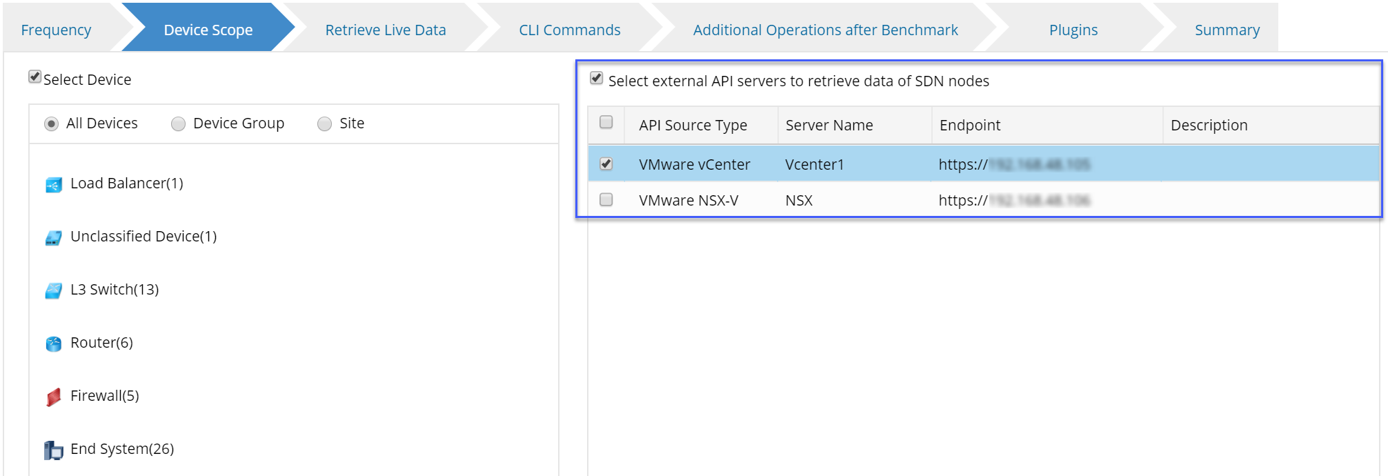 5.On the Device Scope tab, check the Select external API servers to retrieve data of SDN nodes check box, and select a vCenter server.
