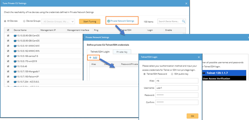 and select Private CLI Settings, then add private Telnet/SSH login credentials and tune the target devices.