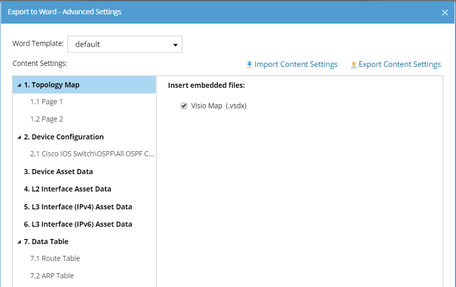 Content Settings determine what contents are included in the exported document from a map. The left side of the setting pane reflects the table of the content of the document, which can be renamed, moved up/down, and removed. The right side reflects the text of the document.