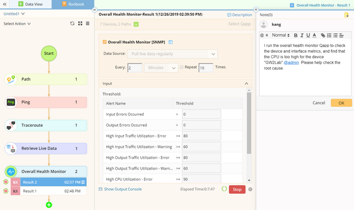 7.Add the Overall Health Monitor node, and then click Run. See Running a Qapp for more reference. After running the Qapp, make a note to describe the issue and enter @ to mention admin for escalation.