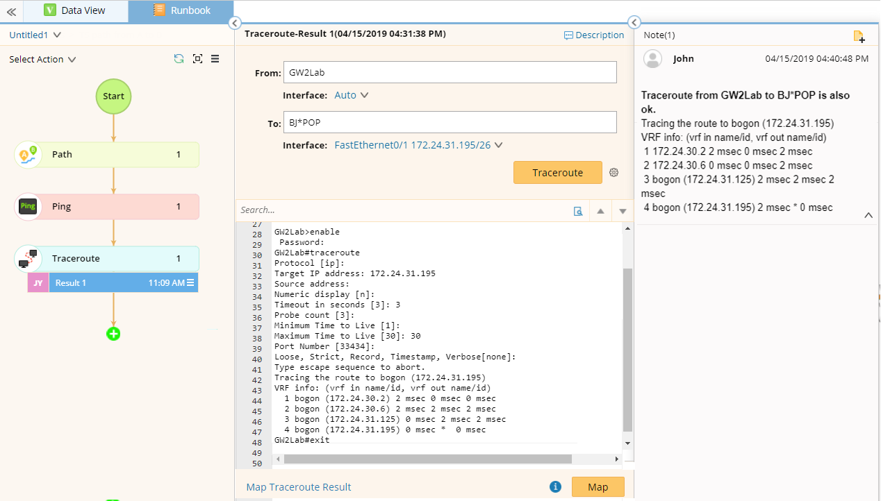 5.Add the Traceroute node and execute the action. Make a note to record the result.