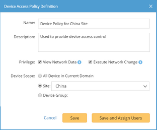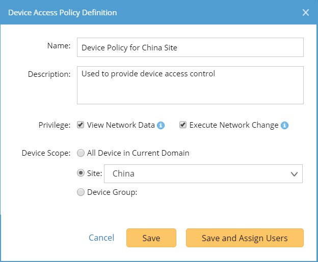 Tip: You can also assign users on the Share Policy tab, or apply the policy to users when adding users in the System Management page. If a defined policy hasn't been assigned to any user, all users do not have the two privileges: View Network Data and Execute Network Change.