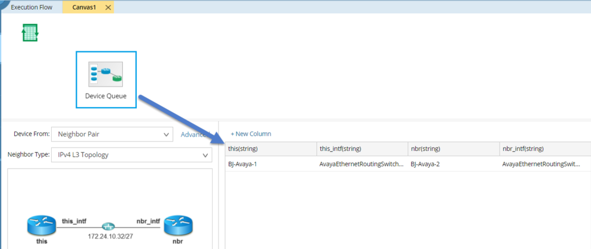 Note: With this option selected, you need to run the Qapp from a map with devices and paths among them. 1)Click the drop-down menu of Device From and select Neighbor Pair. The involved devices will be displayed in the device queue table on the right side. ▪One device per Path (each hop) — includes each device only. ▪Downstream Pair — includes each device and its next-hop (such as next). ▪Upstream Pair — includes each device and its previous hop (such as prev). ▪Path Triplet — includes each device, its previous and next hop. 2)Click Advanced to configure whether to include interface information in the device queue table based on your needs. ▪Do not include interfaces — only includes the device column (such as $this). ▪Include Interfaces — the default option to add two interface columns (such as $_in_intf and $_out_intf). |