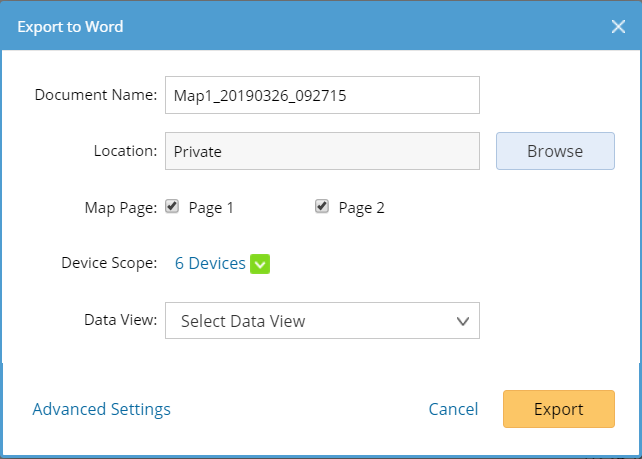 Tip: Click Advanced Settings to customize the Word template and the content contained in the document. See Content Settings for Exporting Map for more details.
